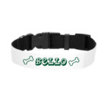 Je hond maakt helemaal de blits met zo’n stevige halsband met een uniek ontworpen full color print. Laat ons de naam van je kleine vriend er haarscherp op drukken of wellicht vind je het leuker om er een opvallend en kleurrijk design op te laten zetten. Onze halsbanden zijn in 3 verschillende maten te bestellen en elke uitvoering is ook nog eens eenvoudig te verstellen zodat hij altijd goed past. Het materiaal is stevig zwart textiel en door de clip sluiting maak je hem makkelijk dicht of open.